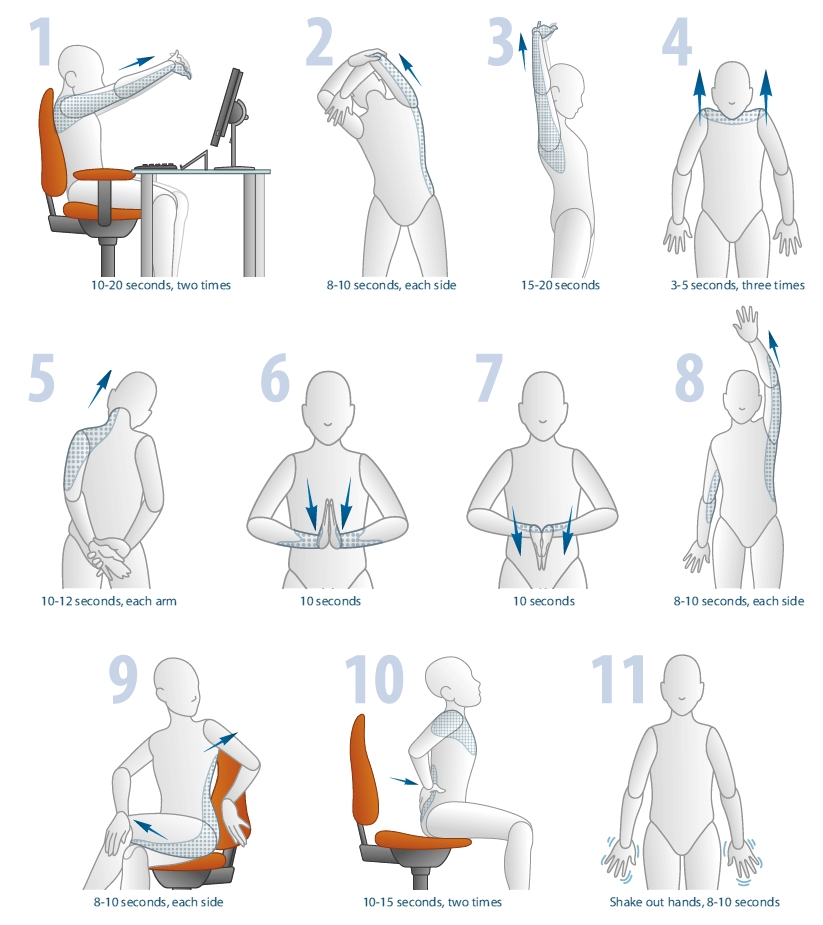 • Take micro-breaks, including “hanging the arms” down at your side (natural position of function) when not using them (try this for 60 seconds every hour or so).