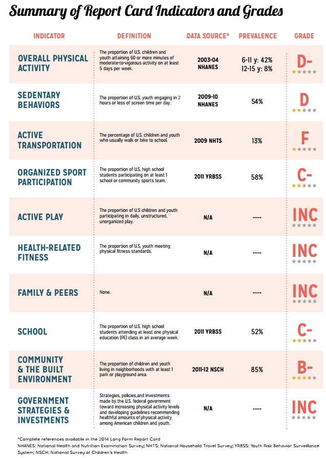The 2014 United States Report Card On Physical Activity For Children & Youth http://www.physicalactivityplan.org/reportcard/NationalReportCard_shortform_final%20for%20web.pdf